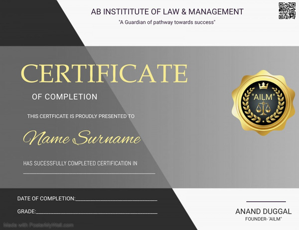 "AB INSTITUTE OF LAW & MANAGEMENT (AILM)" - A UNIT OF AB LAW PARTNER (A LAW FIRM) is incorporated with a purpose to develop, hone the skills of students and professionals by providing the depth & quality knowledge about the particular subject keeping in view the academic and practical aspects especially through online certification courses. After pursuing the certification course(s), the students would competent to use their skills in practical- professional life. "AILM" is registered with State Registration certificate of establishment 2021003260 (Department of Labour); Central Government (MSME: UDYAM-DL-1-0007873) and duly certified under International standards; Quality Management System of United Kingdom, Scotland associated licensing services; ISO 9001-2015 Certificate No: 3072/DL-Q/180121.